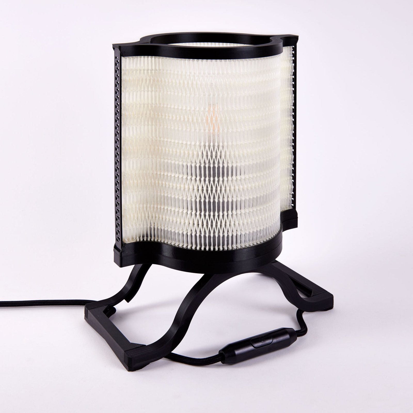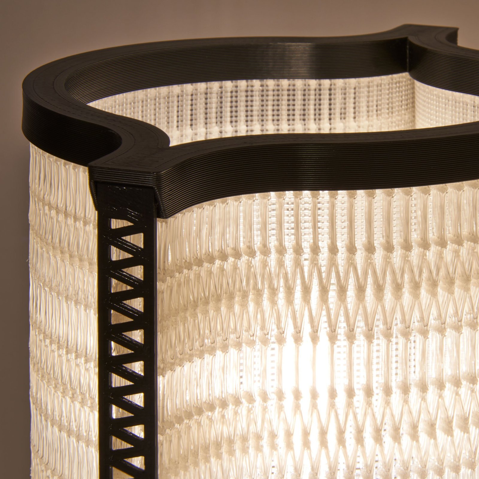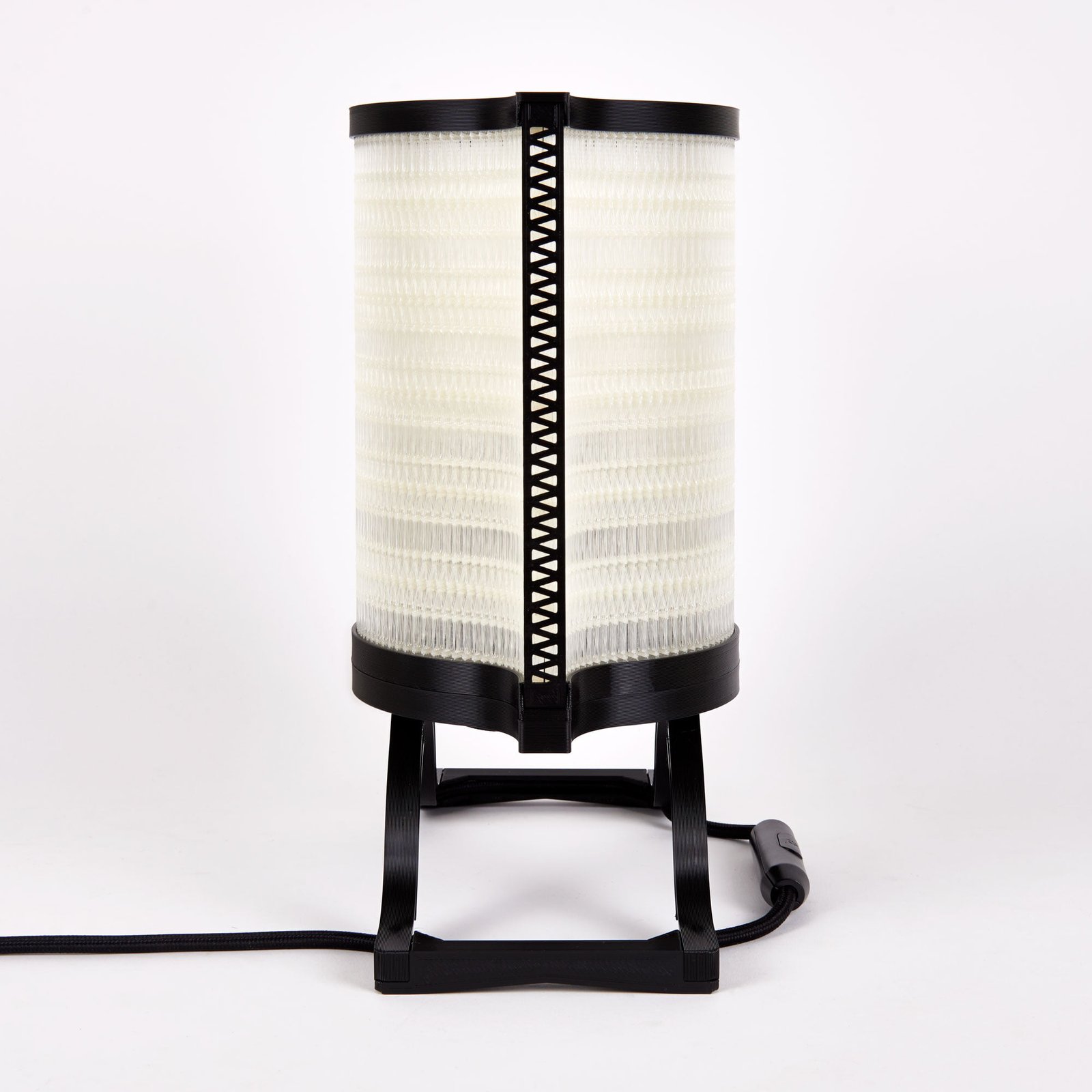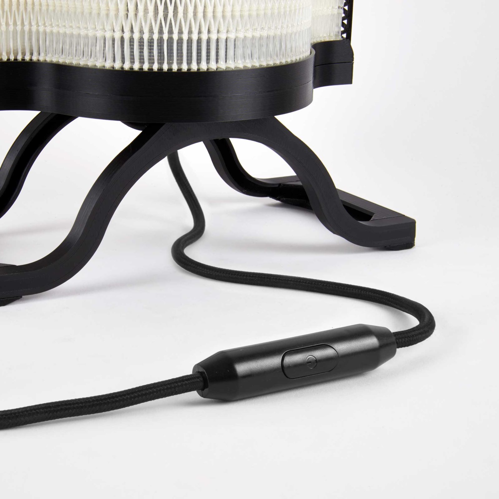 La lampe à poser Nonine est issue de mes recherches sur les spécificités de l’impression 3D à dépôt de fil. En jouant sur les possibilités de cette technologie, j’ai créé un « matériau » mêlant des éléments solides et des zones presque « tissées », qui donnent à l’abat-jour son esthétique particulière. Chaque pièce constituant la lampe a été dessinée en fonction des contraintes de l’impression 3D, de façon à utiliser un minimum de matière.