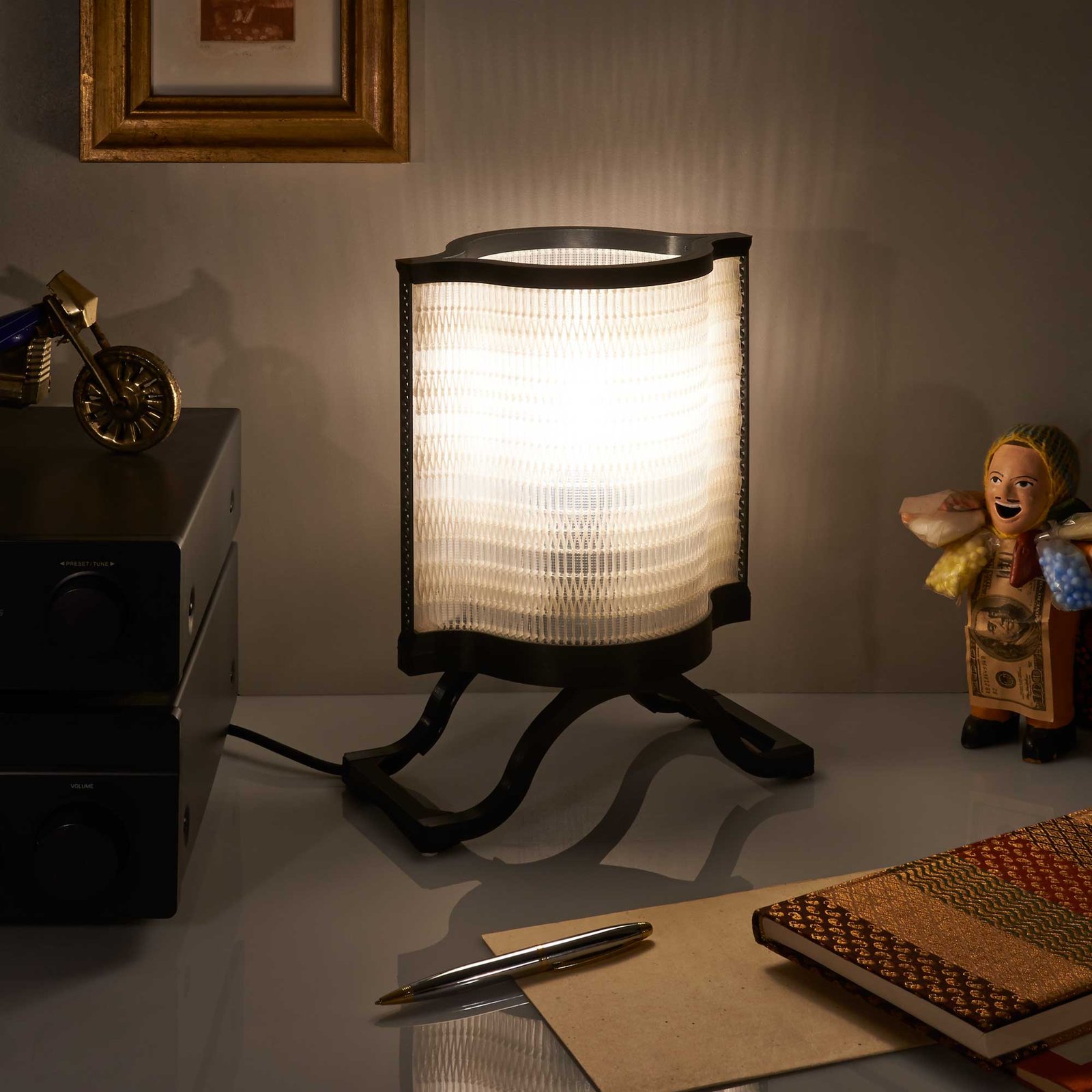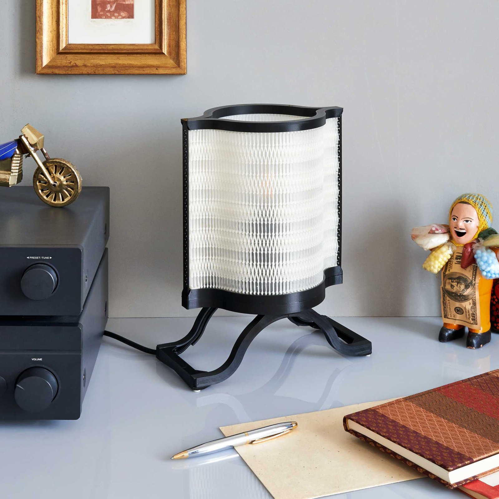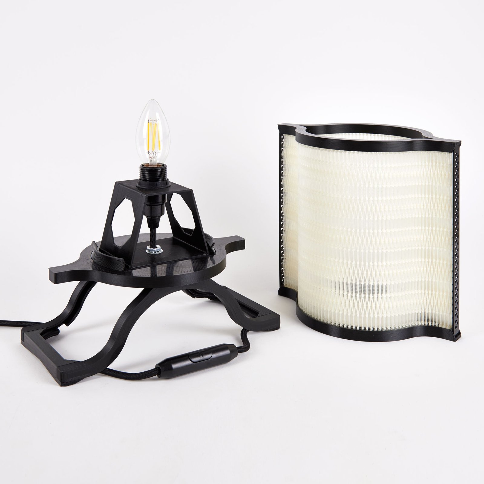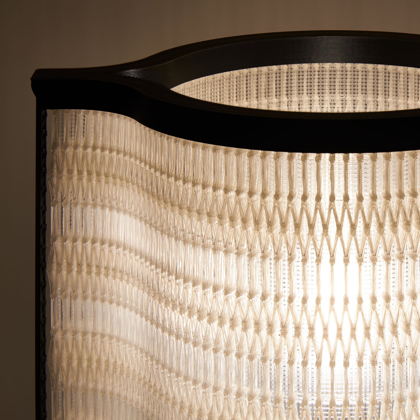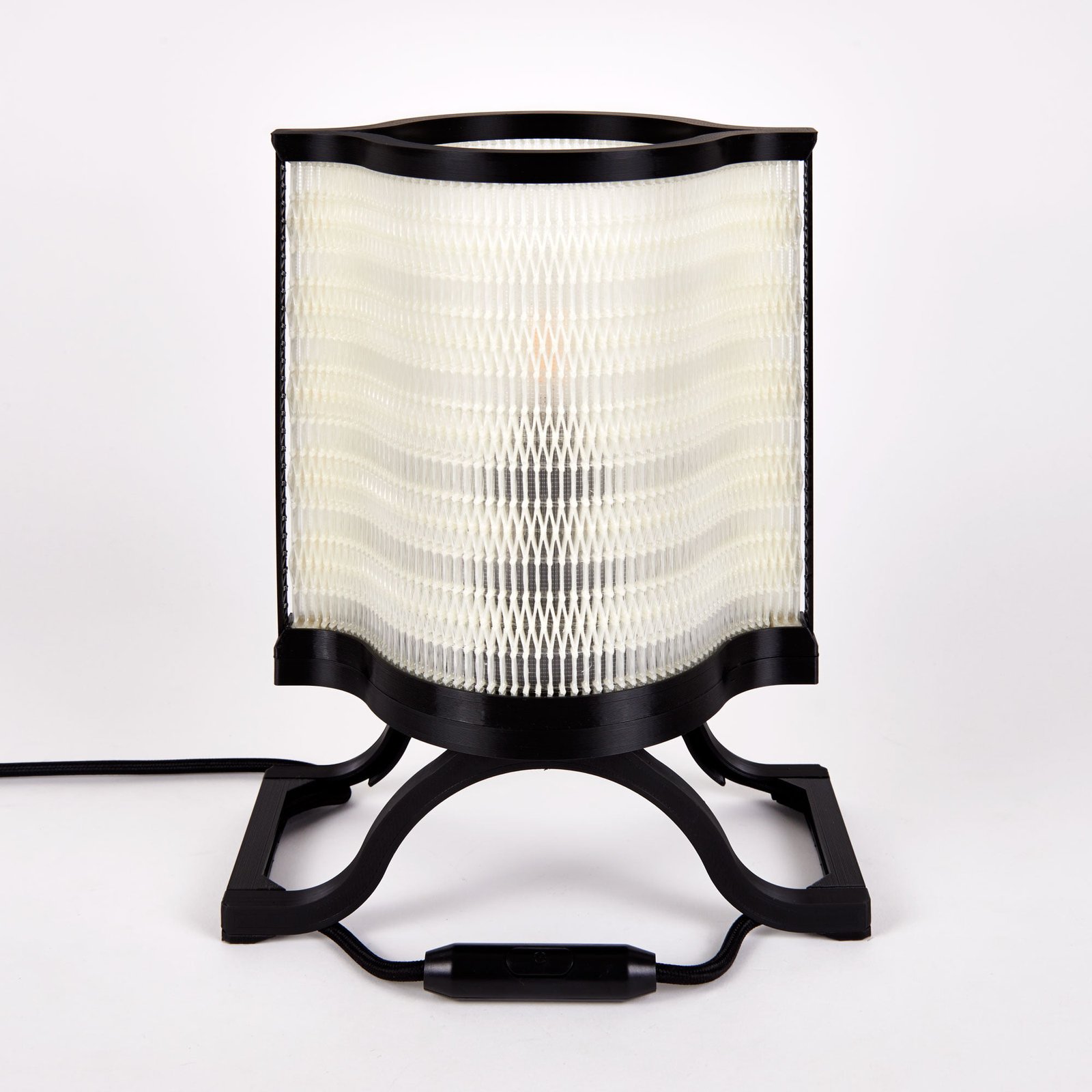 La lampe à poser Nonine est issue de mes recherches sur les spécificités de l’impression 3D à dépôt de fil. En jouant sur les possibilités de cette technologie, j’ai créé un « matériau » mêlant des éléments solides et des zones presque « tissées », qui donnent à l’abat-jour son esthétique particulière. Chaque pièce constituant la lampe a été dessinée en fonction des contraintes de l’impression 3D, de façon à utiliser un minimum de matière.